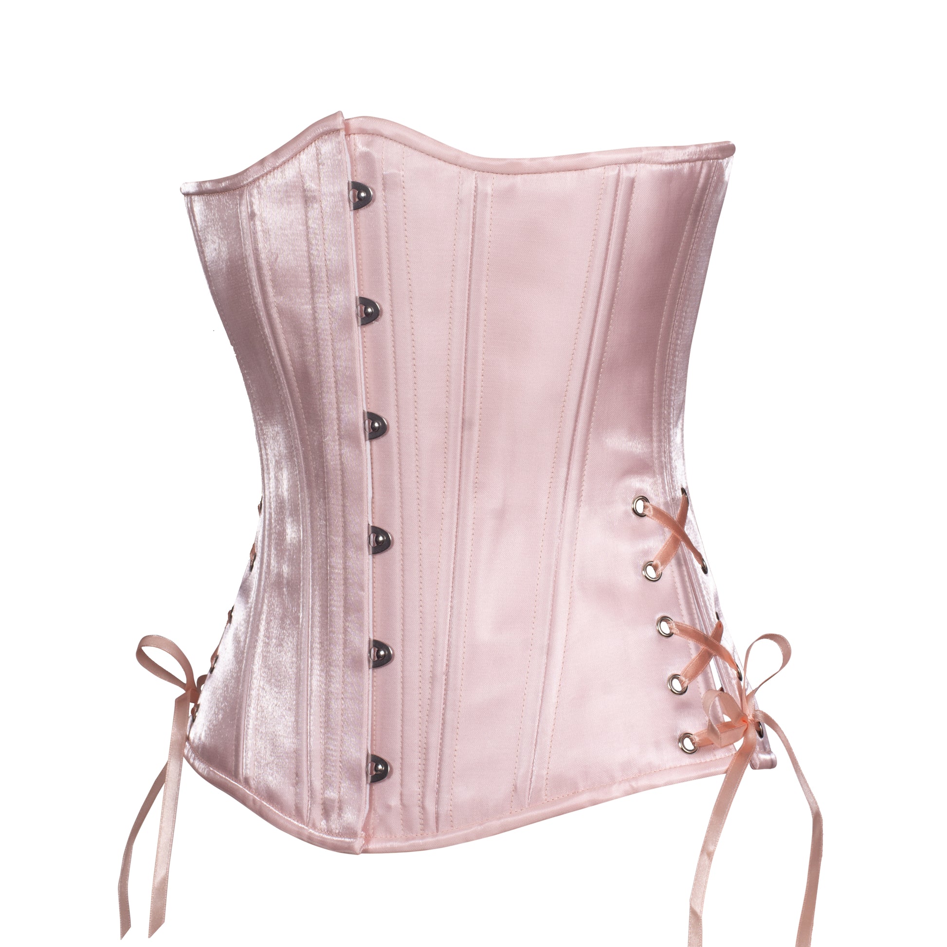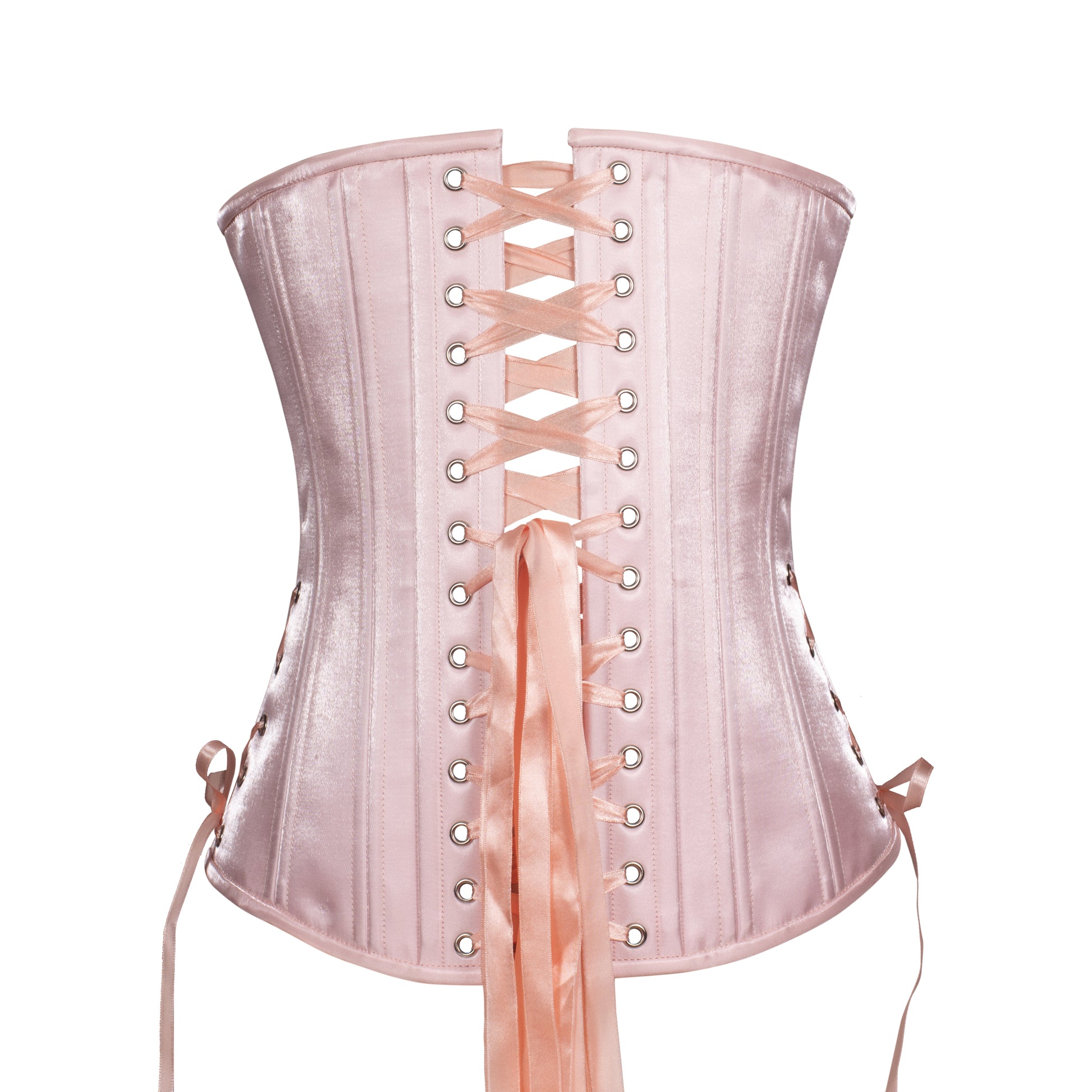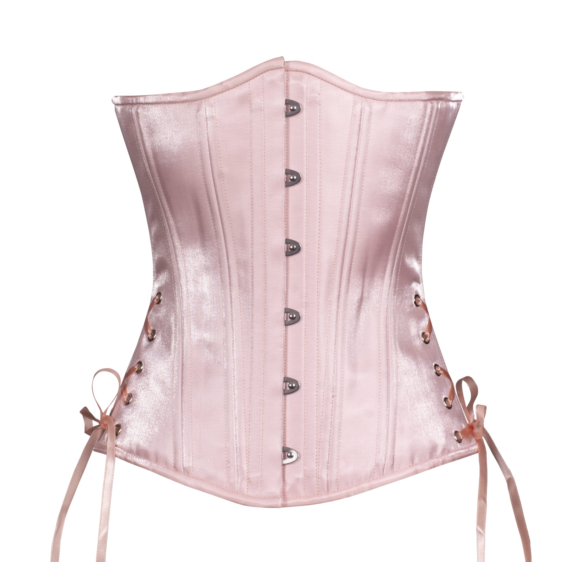 Crafted from glossy crystal satin with a soft, wet-look sheen, this corset glows like silk under the light. The delicate blush pink evokes the elegance of satin pointe shoes and the dreamy haze of a spring morning. Photos cannot capture its true charm—you have to see it sparkle in person!