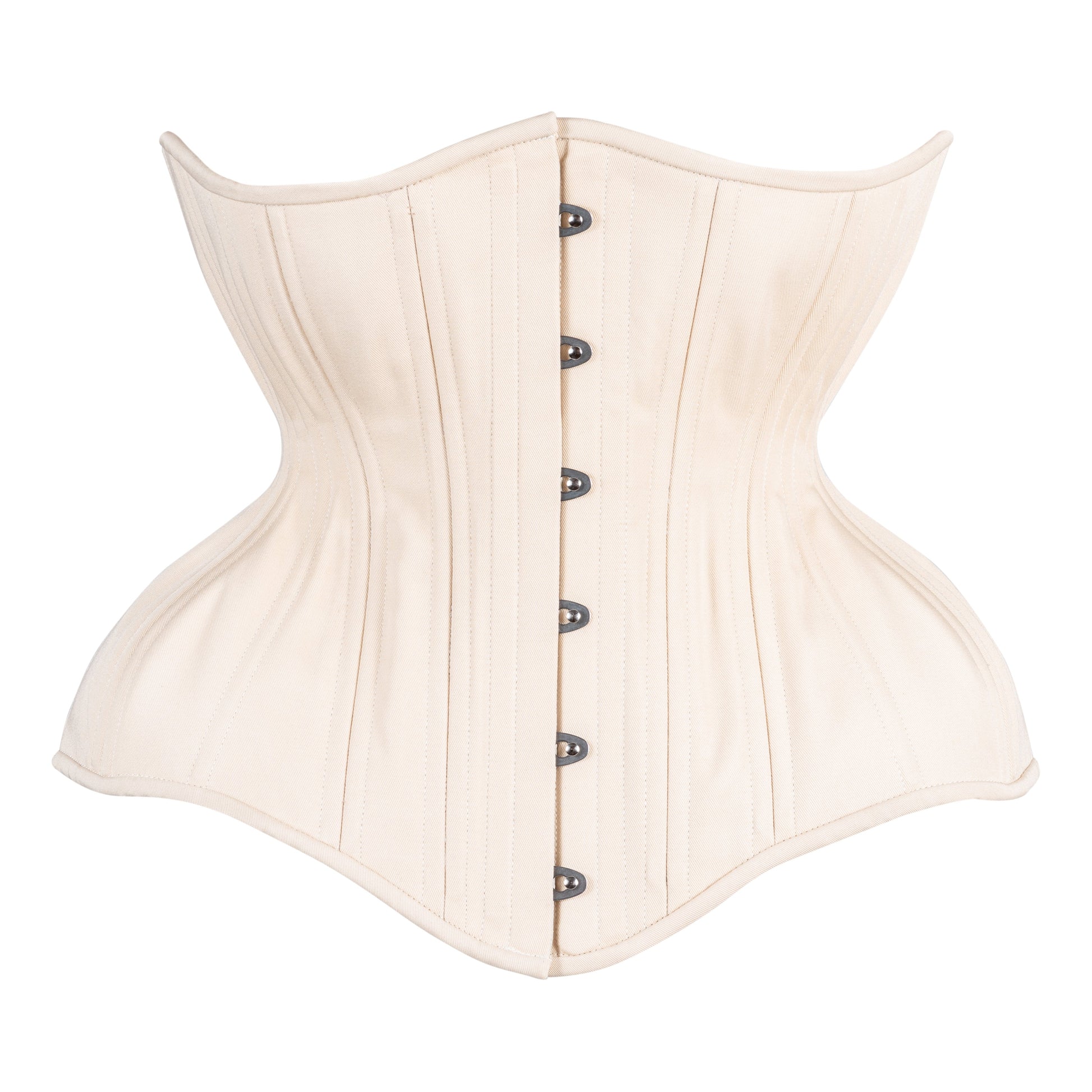 Our beige 100% cotton corset is the perfect corset for stealthing. Made with two layers of cotton twill, laminated for strength to a soft 100% cotton outer layer. Even curvier than the Hourglass cut, the Gemini cut is designed for those with naturally curvy figures or experienced corset wearers. Comes with 6 garter tabs.