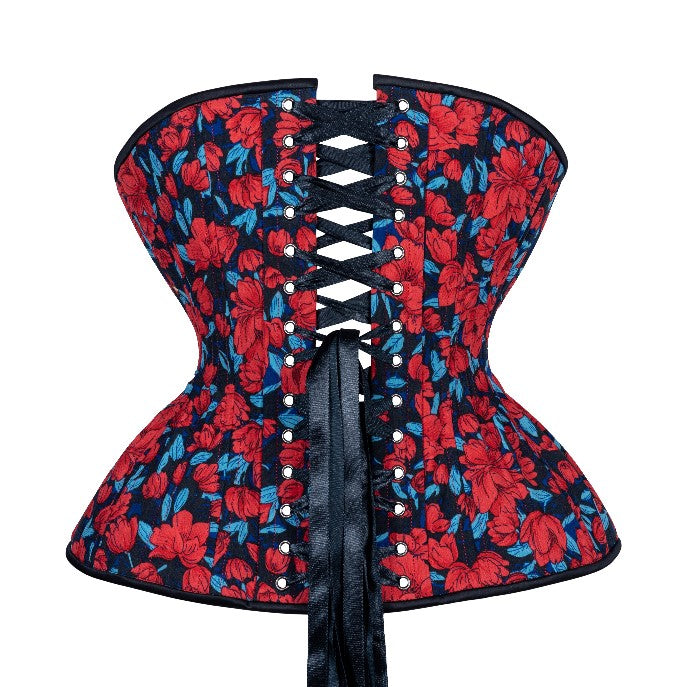 Bright red tulips on a black background, with stunning accents of blue will make you bloom with joy! This is a 100% cotton corset available in the Gemini Long to accent your curves and bring brightness to any outfit. Can be worn as part of your outfit and with the cotton fabric, it is also great for stealthing.