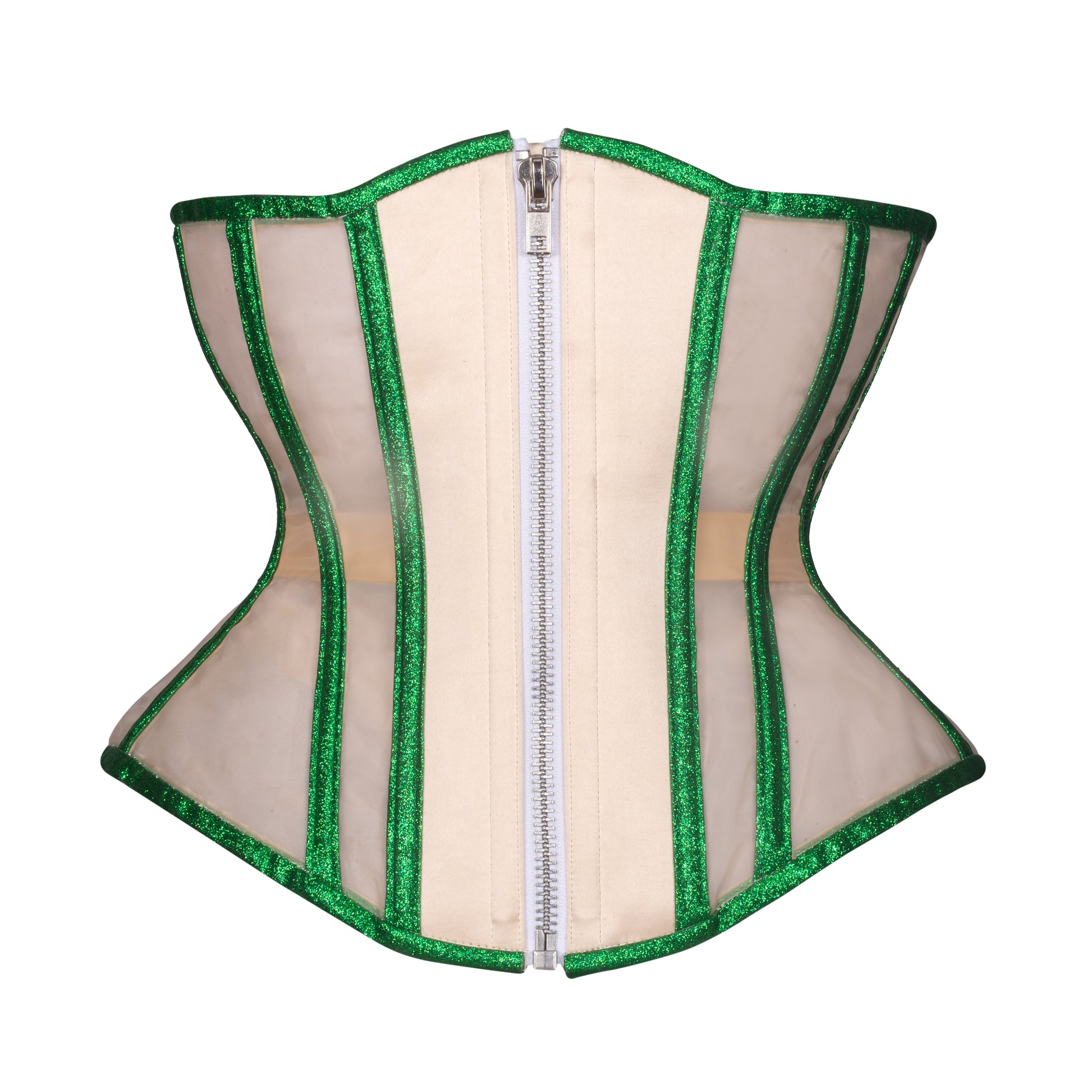 Shine bright on stage with our Glitter Mesh Corset in a classic Hourglass shape. This is perfect for performers and burlesque artists. This sample is similar to our Emerald Glitter mesh, but with a beige satin front, framed by glitter vinyl boning channels and trim. Ideal for Halloween, themed events, or anytime you want extra sparkle and attitude.