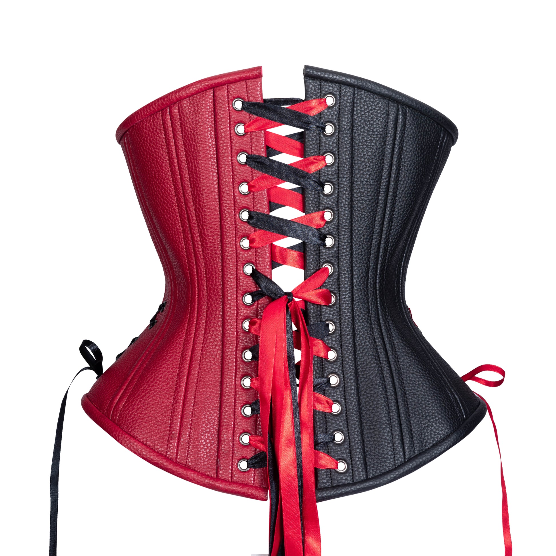 Join our suicide squad with the Harlequin Ruckus corsets inspired by DC's Harley Quinn. This masterpiece corset is made of a textured synthetic red and black leather with a final touch of contrasting hip ties and lacings. Doesn't matter if you're going for Harley Quinn the super-villain or Harley Quinn the anti-hero, this corset can be worked into your cosplay or your street clothes or both!