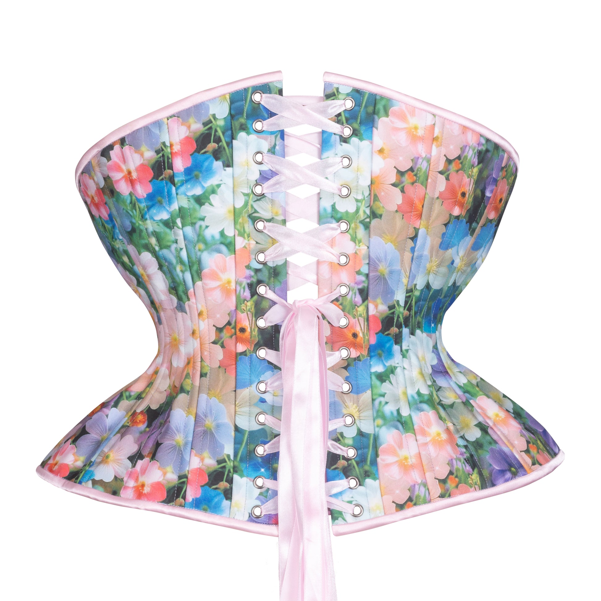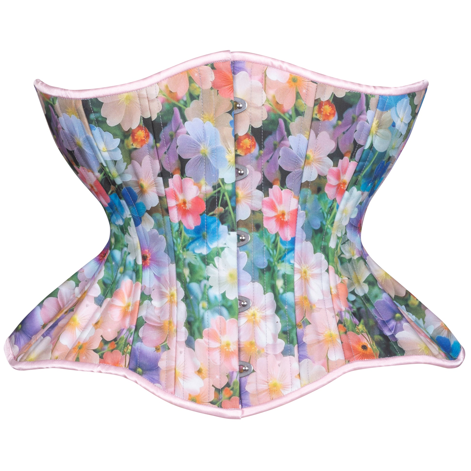 The Impatiens Embrace corset is a true hidden treasure. The photos do not do this fabric justice! This sophisticated corset is finely crafted from a fabric adorned with a vibrant, almost pastel-like floral pattern, featuring shades of lilac, blue, pink, and green on a dark background. It is beautifully complemented by light pink satin trims and contrasting light pink single-faced ribbons, adding to its elegant appeal.