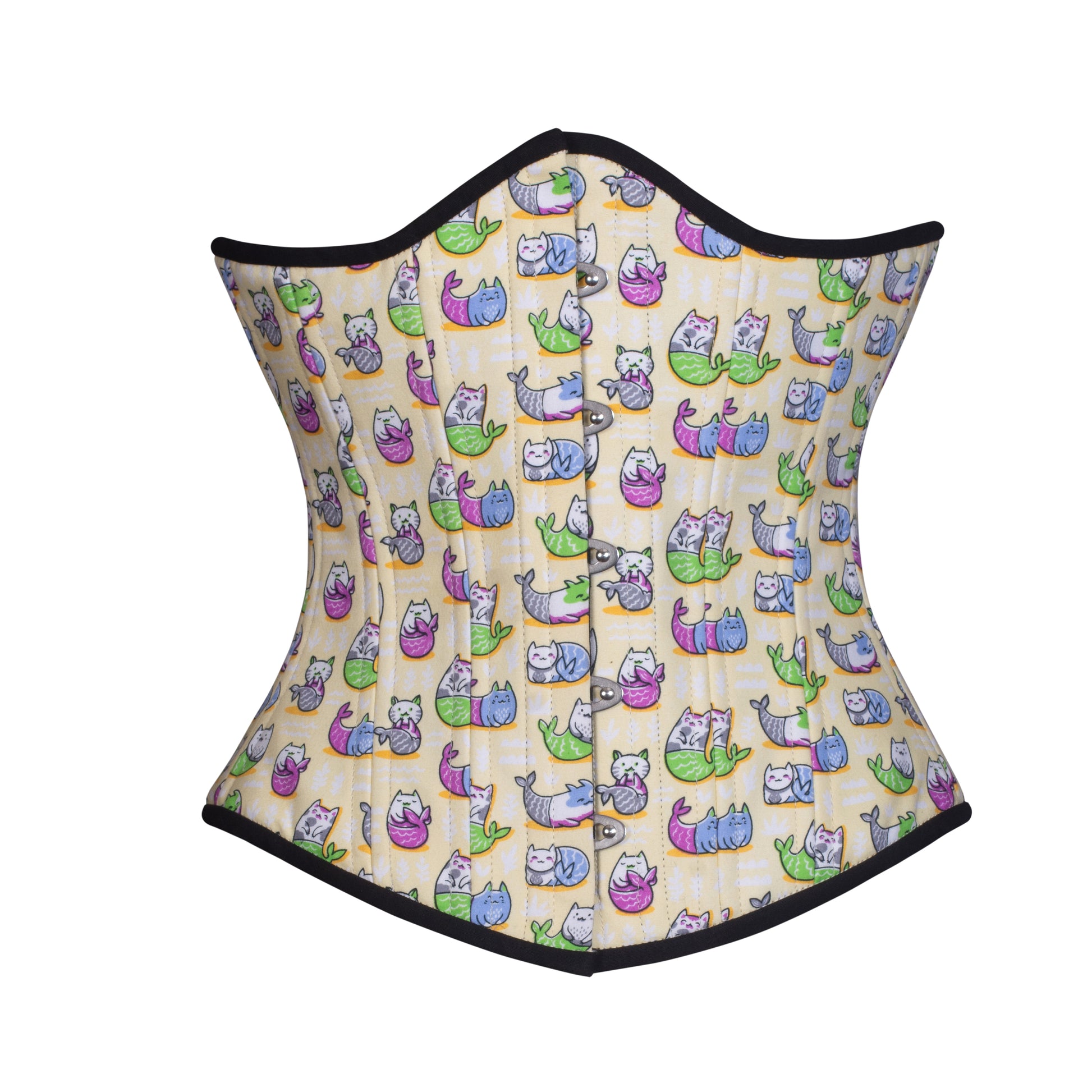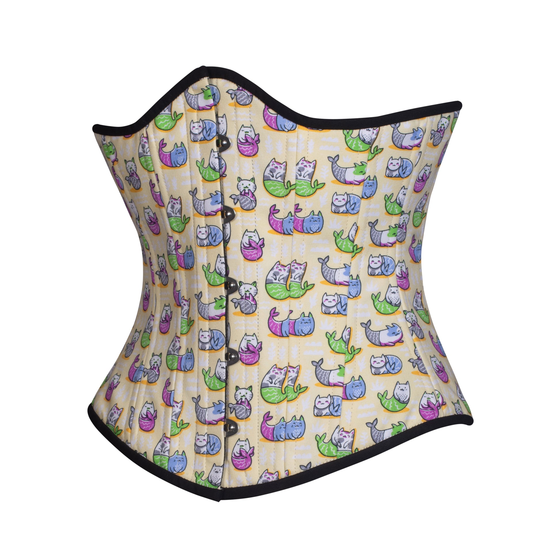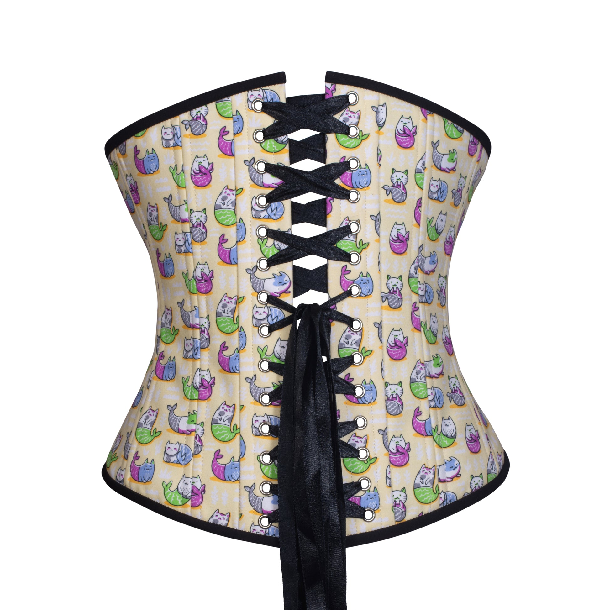 Meow! Playful Mercats Corset is Meow-gical and oh-so-cute! This light yellow cotton corset is covered in colorful little mercats, with black trim and lacing to make them pop. A purr-fectly playful piece to brighten up your corset collection! This is one catfish we can get behind.