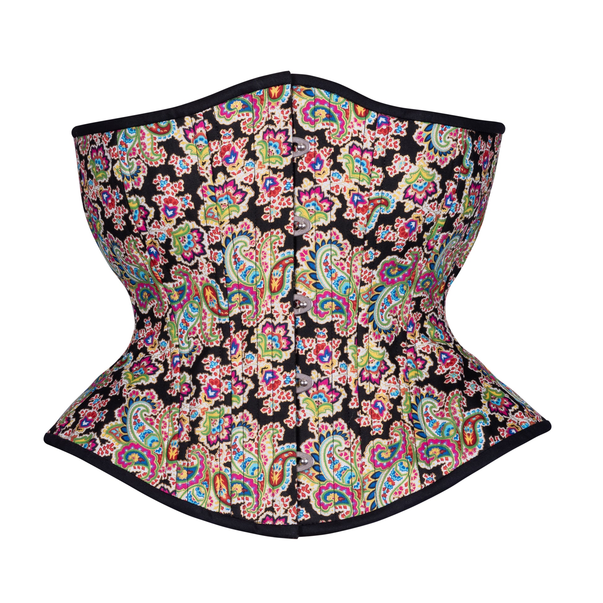It's time to add a fun and cute item to your Novice Collection. This corset features a vivid Rainbow Fractals print on a black cotton fabric. The inspiration for this psychedelic fabric was Louis Wain's artwork on cats. Featuring one layer of high quality cotton that is laminated to an inner layer of cotton twill. Double steel boned and a full waist tape. It’s the same Hourglass silhouette you know and love, and perfect for first time corset wearers.