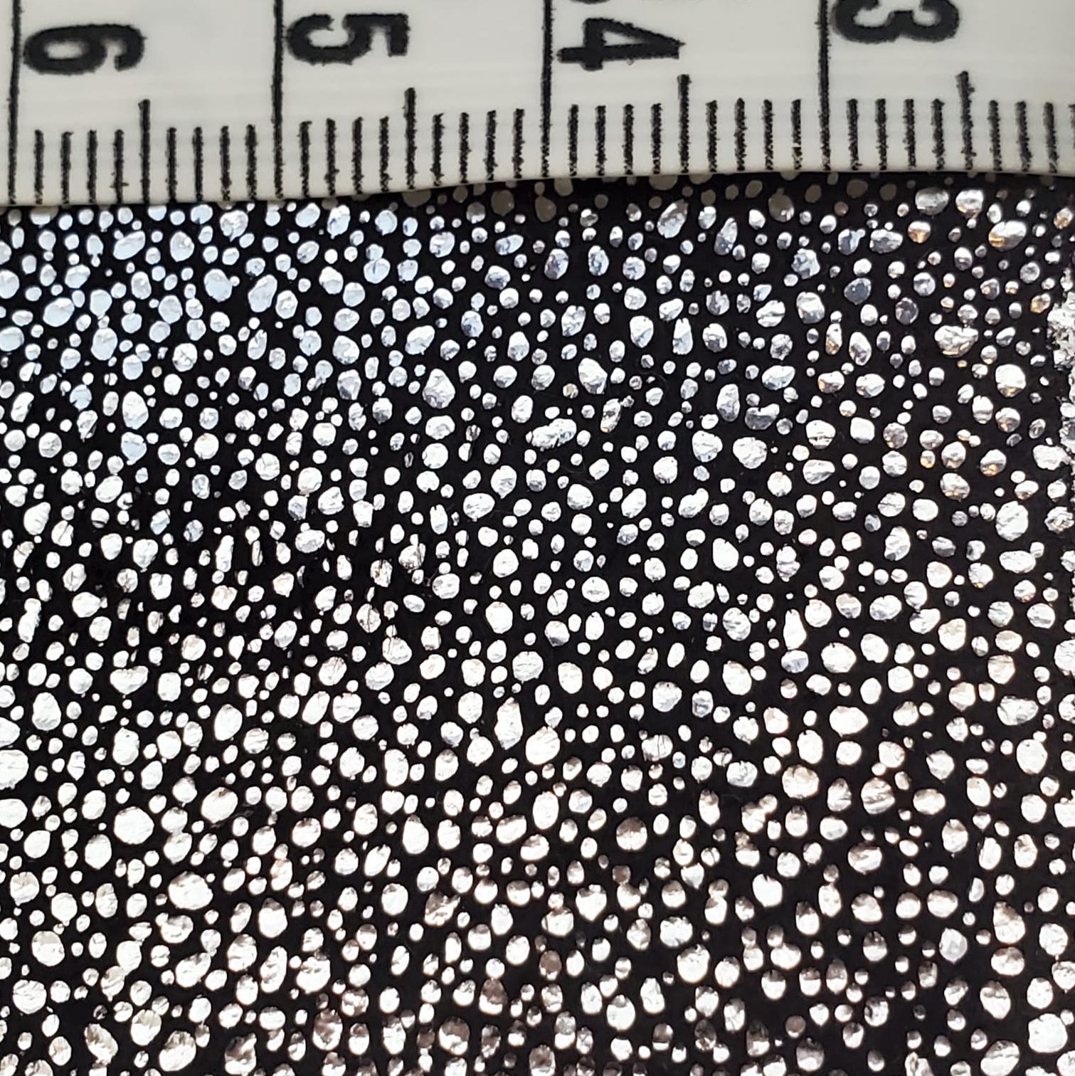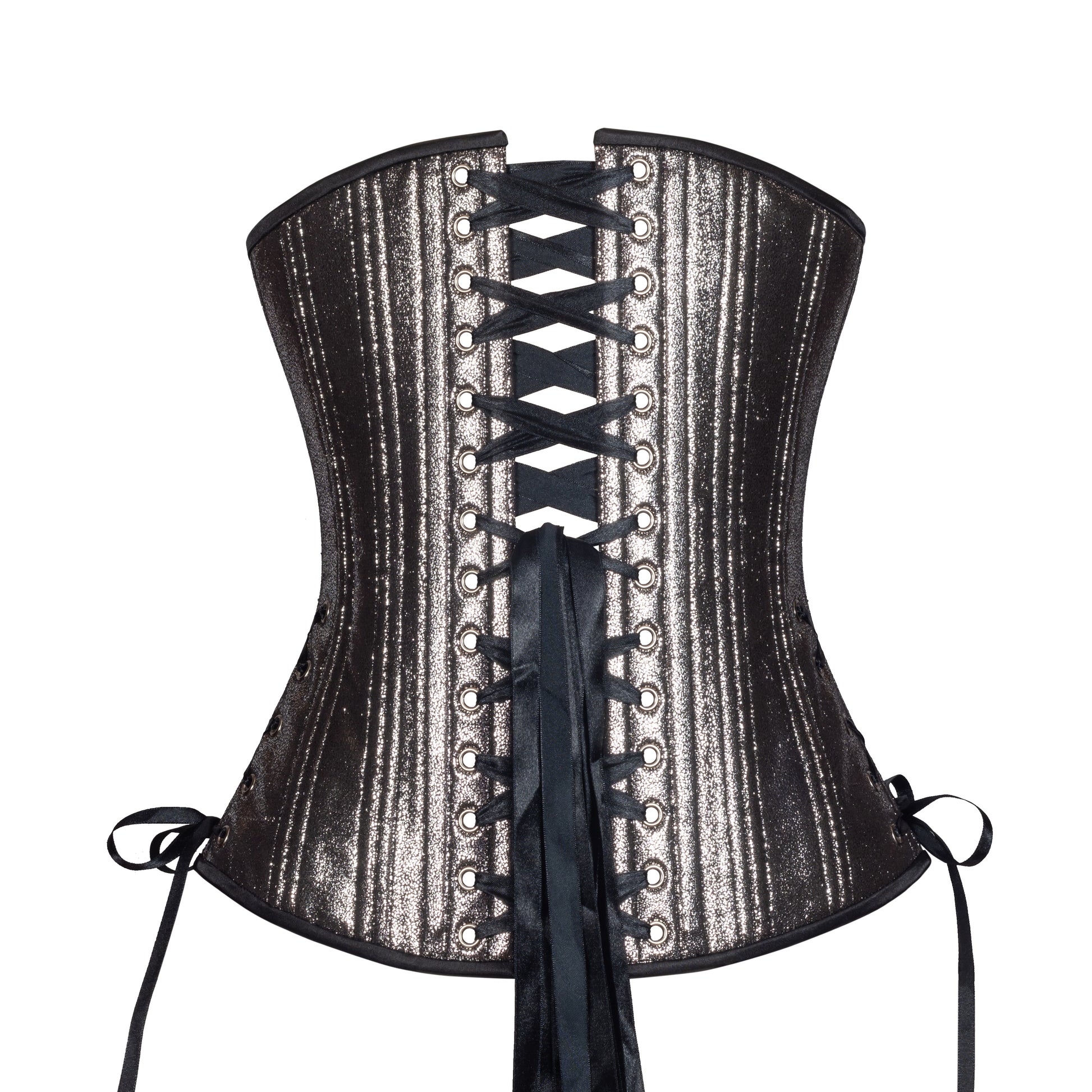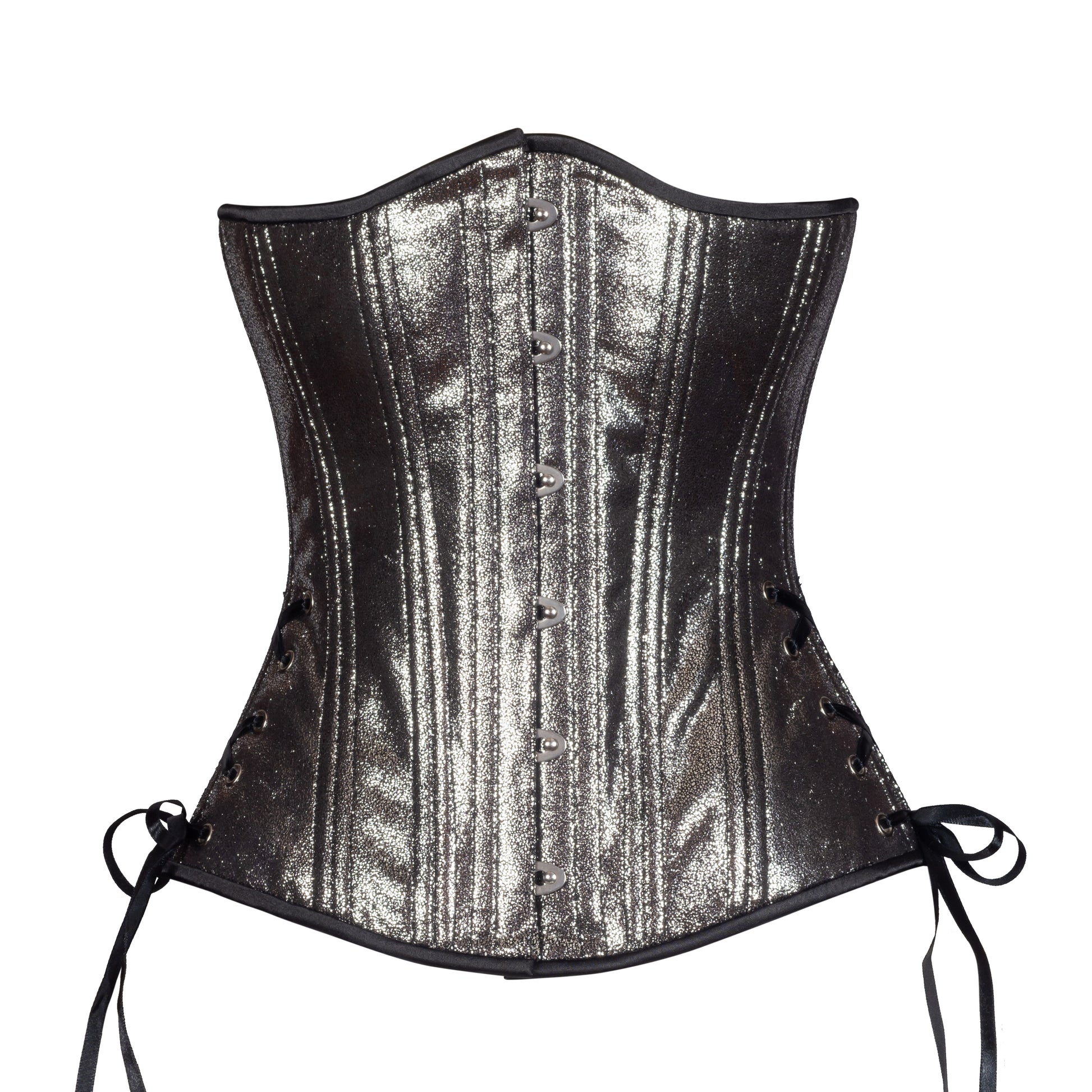The Silver Mist corset features millions of stunning soft shiny silver ink flecks, designed to reflect light. Misted onto a black cotton backing, the Silver Mist takes on a shimmering pewter effect. This is not a glitter corset. There is effectively no fallout. This fabric is so unique, looking like a cross between metallic lamé fabric, or wet-look soft vinyl... but more breathable, and will not tear!