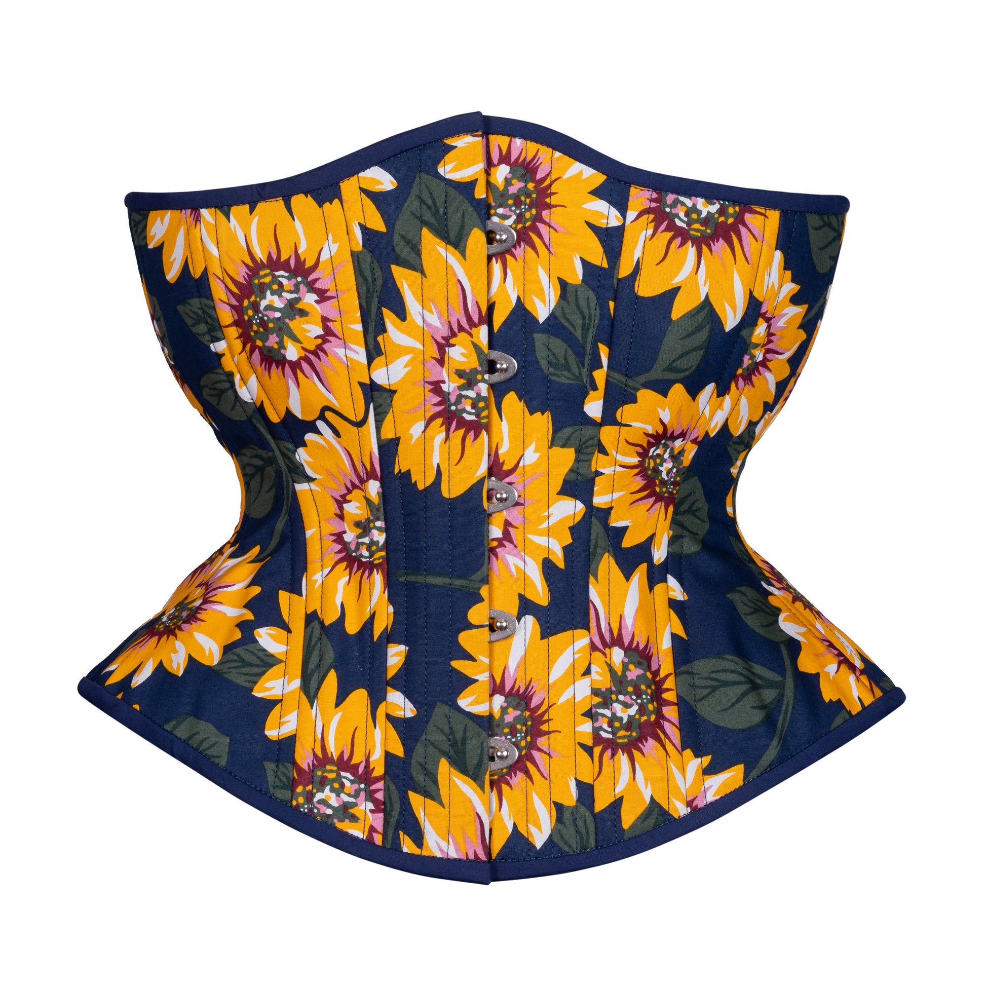 Sunflowers at Dusk! Bright yellow sunflowers on a crisp navy blue background make these sunflowers really pop. More sunflowers for more joy! Made of 100% cotton fabric and authentic steel bones, get the the curves you deserve and shine like the sun!
