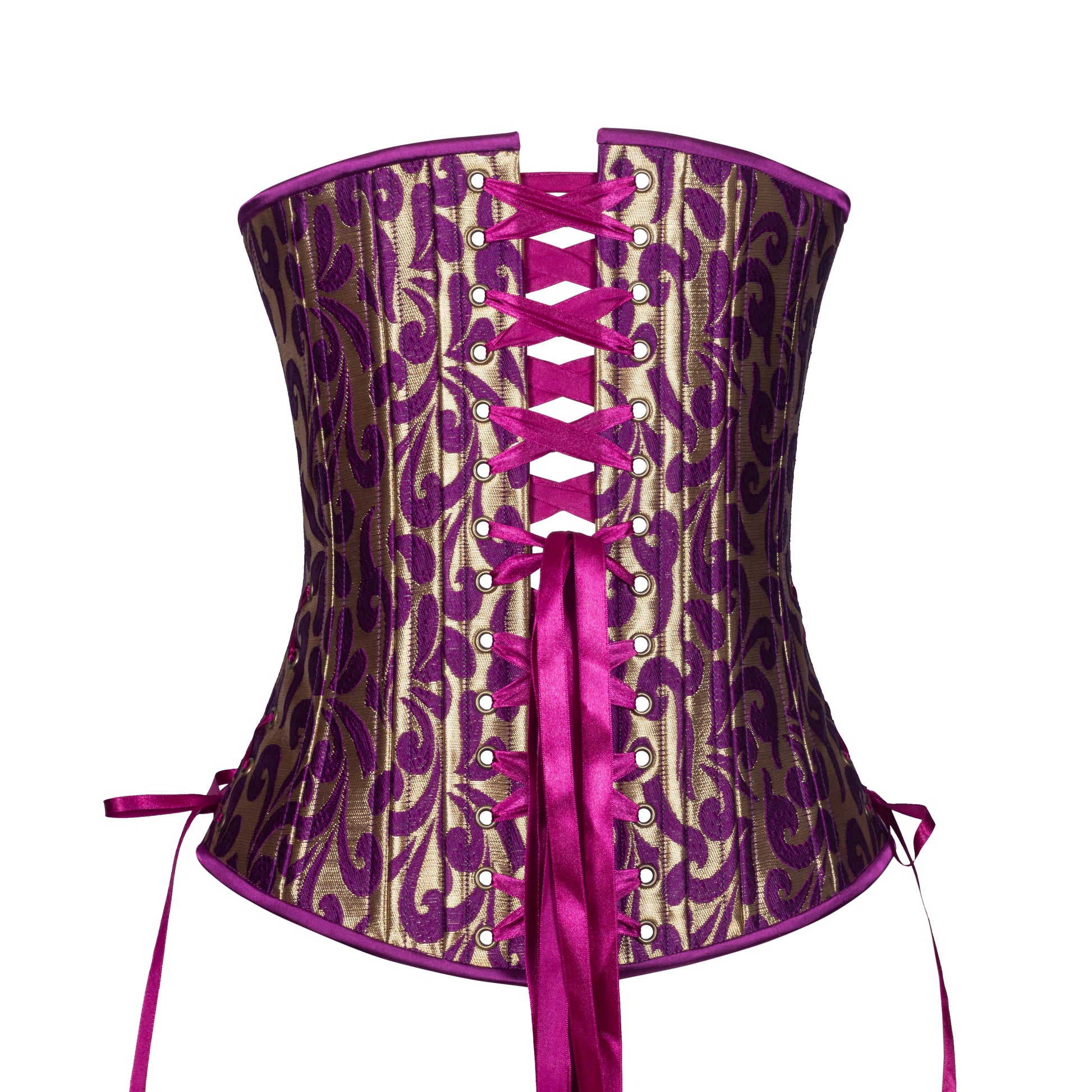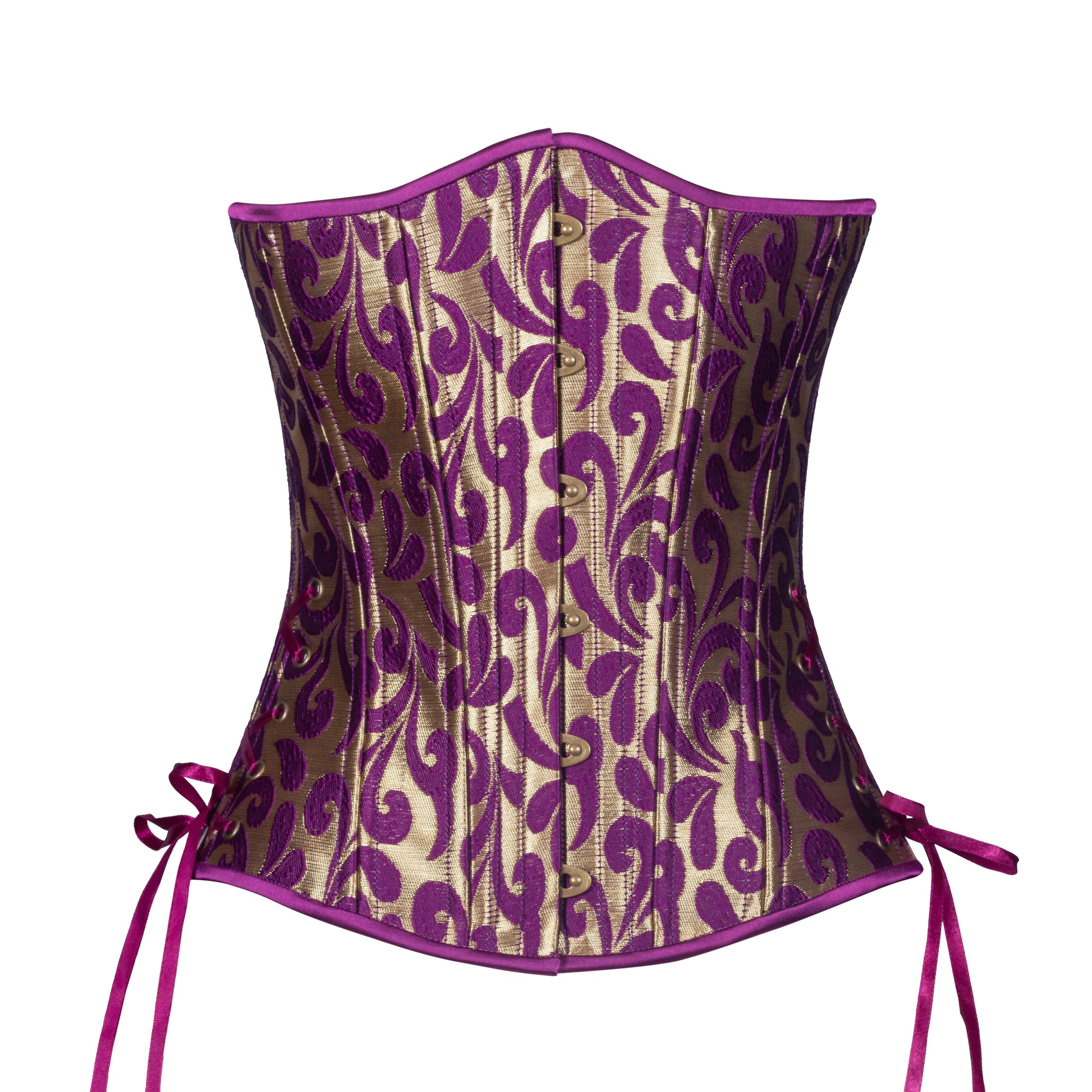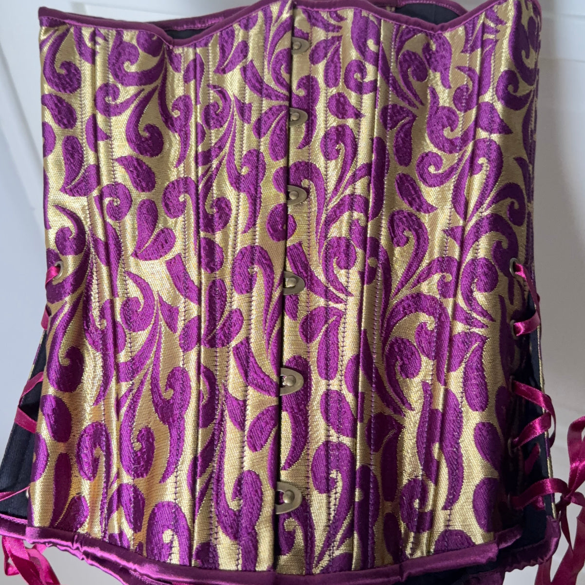 The Swirling Eminence Corset features a prominent design of swirling, ornate patterns in vibrant purple, set against a gold background with a brocade or woven texture. It is trimmed and laced with purple satin, giving it a rich, textured, and slightly raised feel—typical of such intricate patterns. The interplay between the purple and gold creates a luxurious and elegant aesthetic.